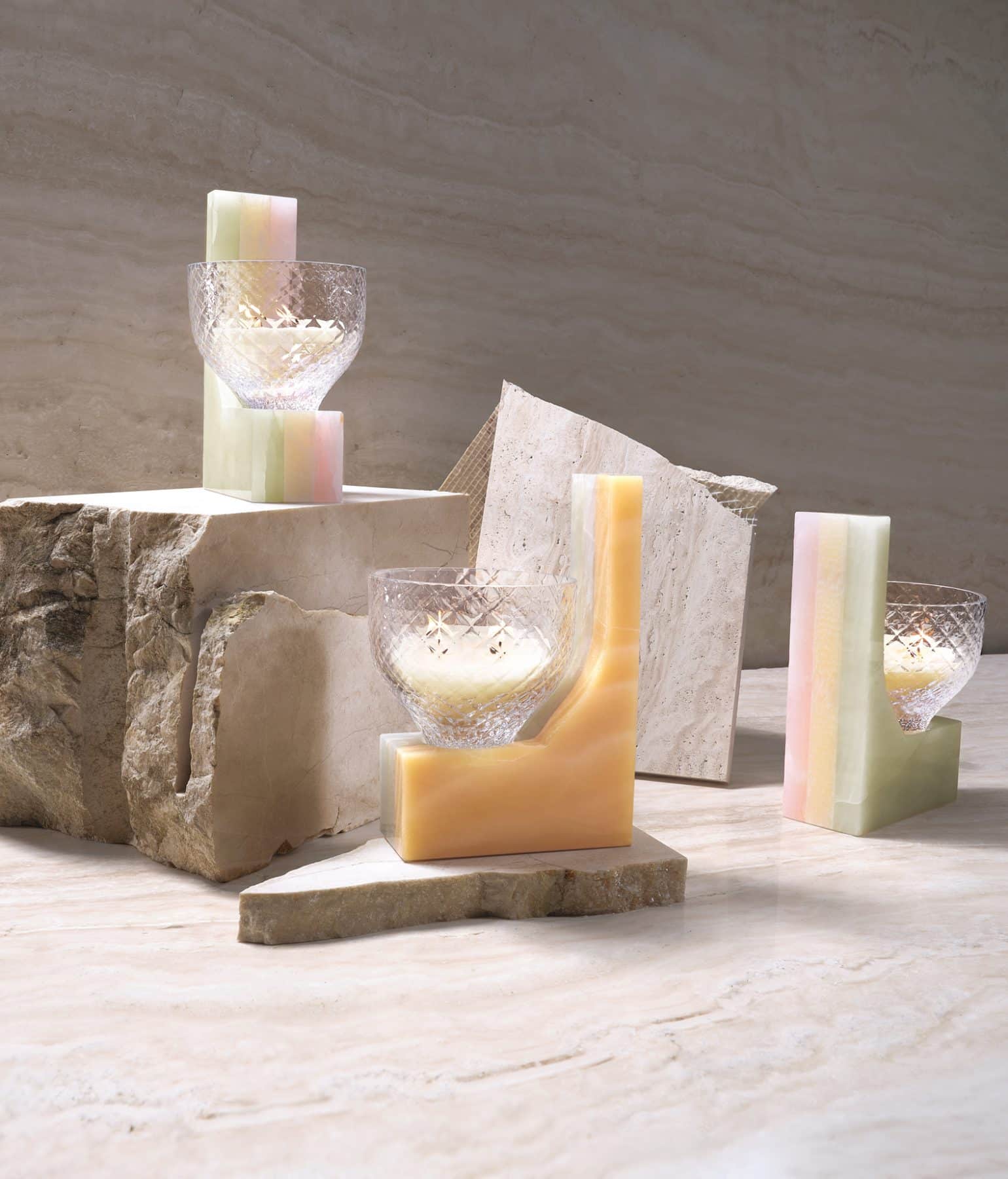 • Includes: Hand-blown glasswork candle holder, onyx stone object, candle cup